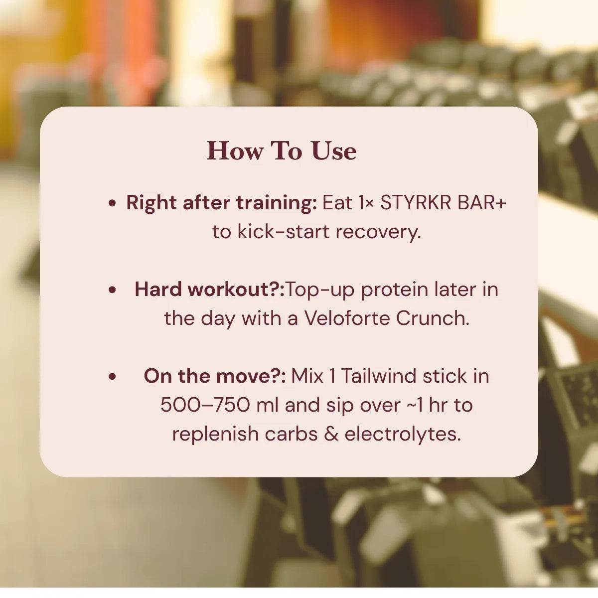 Some days you need carbs now and protein all day, without a blender. This 9-piece kit pairs fast-mix Tailwind for the hour after rides/runs with two bar types: STYRKR BAR+ for classic 3:1 recovery and Veloforte Crunch for a bigger protein hit later. Easy to stash, easy on the gut, and tasty enough to make getting your protein macros a joy.